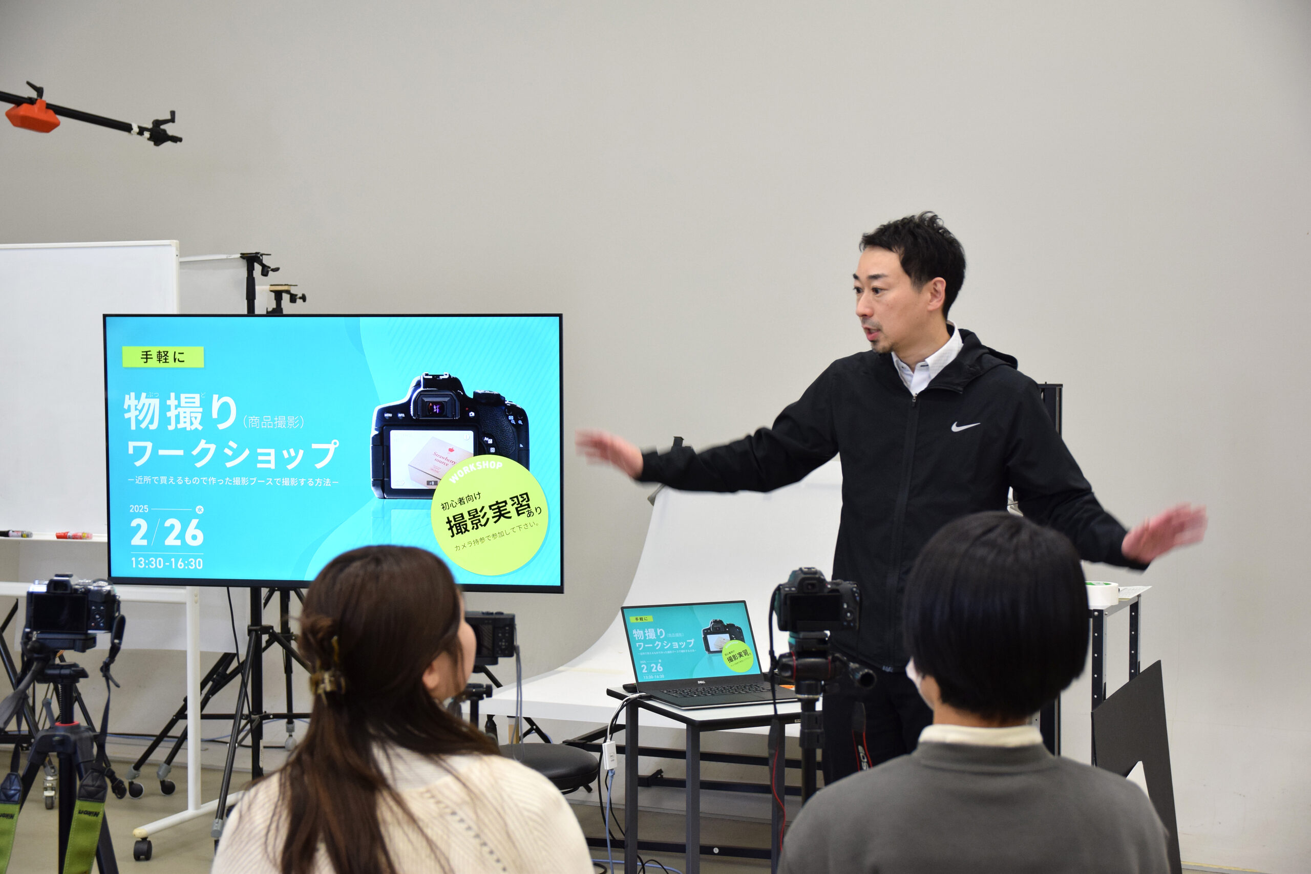 ワークショップの後半は“撮影実習”の時間です。会場に、ホームセンターなどで手軽に買える資材で作った撮影ブースが設置され、参加者は自分のカメラを使って実際に“物撮り”に挑戦しました。