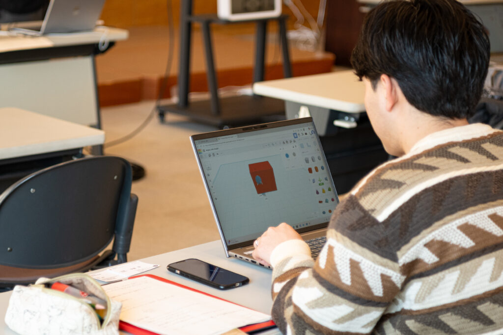 受講生はWebブラウザ上で動作する3D-CADを使い、設計の基本操作を体験しました。作成したデータは3Dプリンター用の形式で保存できるため、自分のアイデアが形になる実感が湧いてきたようです。