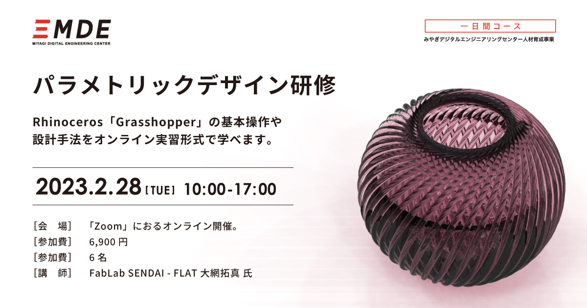 ※例年対面形式で行っていた,みやぎデジタルエンジニアリングセンター「パラメトリックデザインコース」の短縮版の内容になります。以前にご受講いただいた方は,内容が重複しますが,復習目的でもご参加いただけます。