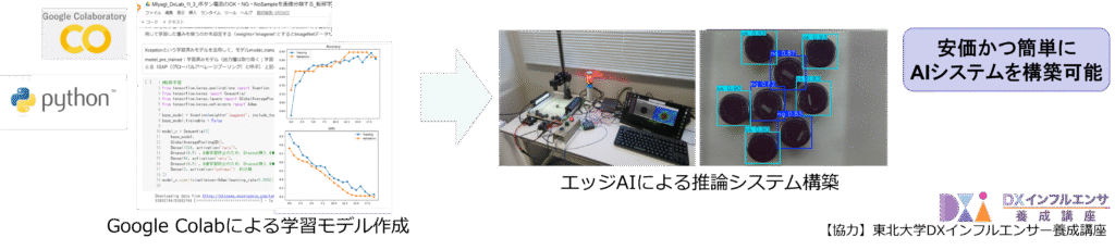クラウド上で使用できる“無料”のツールと安価な“エッジコンピュータ”を用いて、実際に動作しAI活用をイメージすることができる「AI外観画像検査デモシステム」を構築しました。比較的安価かつ簡単にAIシステムを構築することができます。