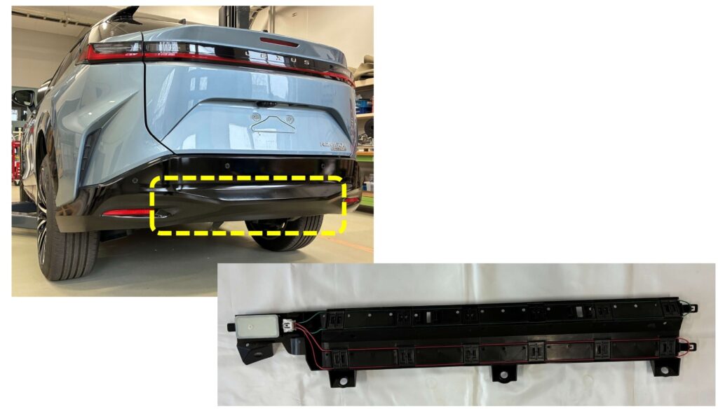 リヤバンパ中央下部に足を近づけて離すことで、バックドアを自動的に開くことができるハンズフリーパワーバックドア機能を作動させるためのセンサーです。